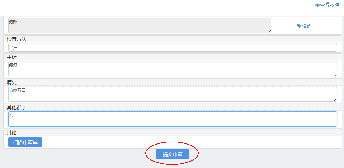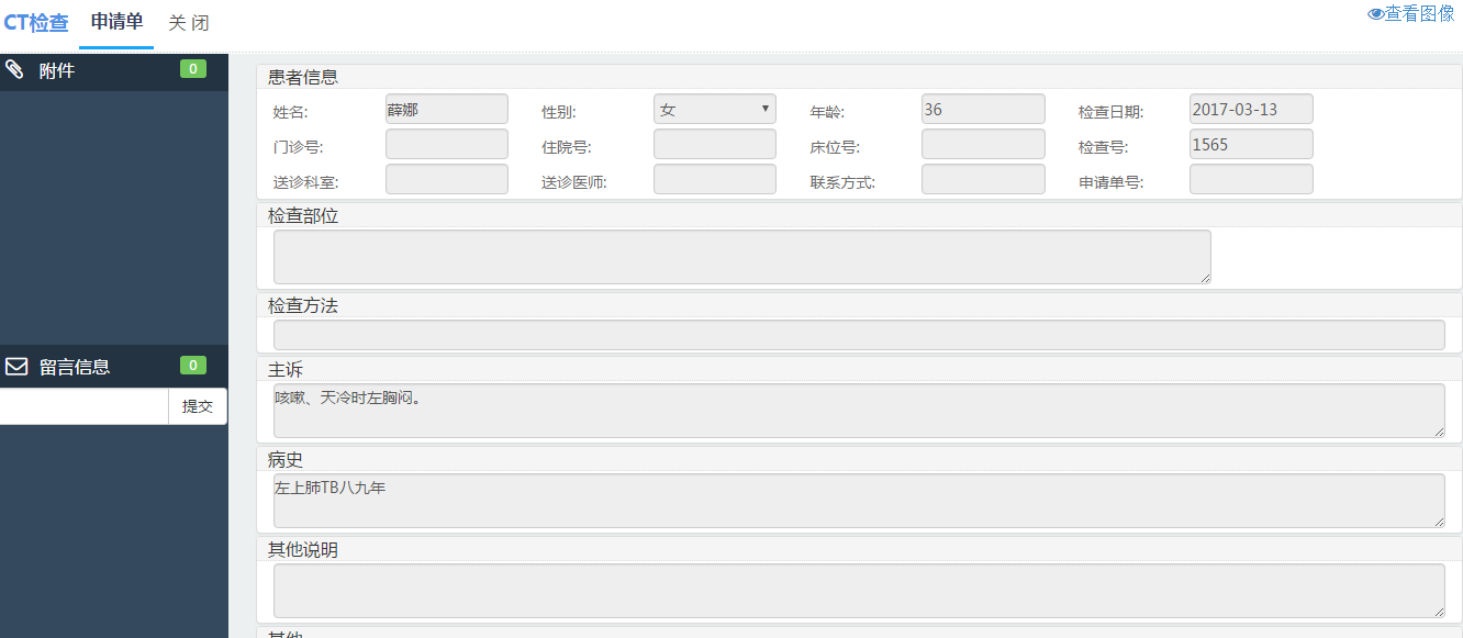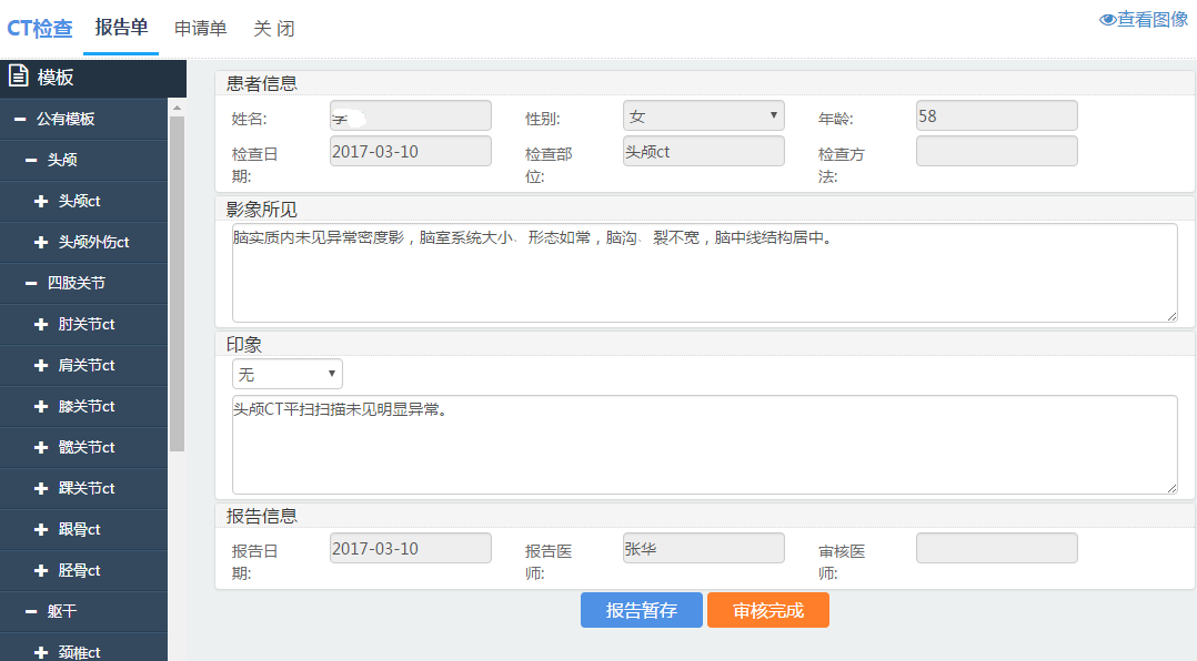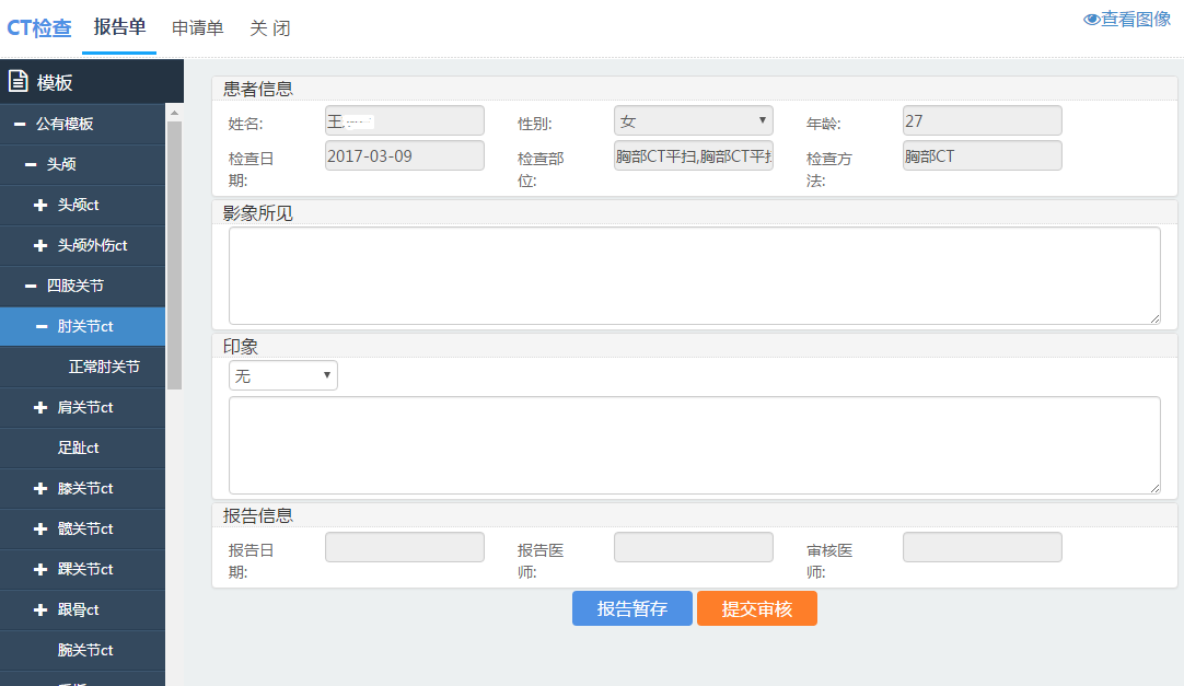 点左上方的“申请单”可查看申请单,“报告单”返回书写报告界面。 报告书写完成后,点“提交审核”进入审核流程。