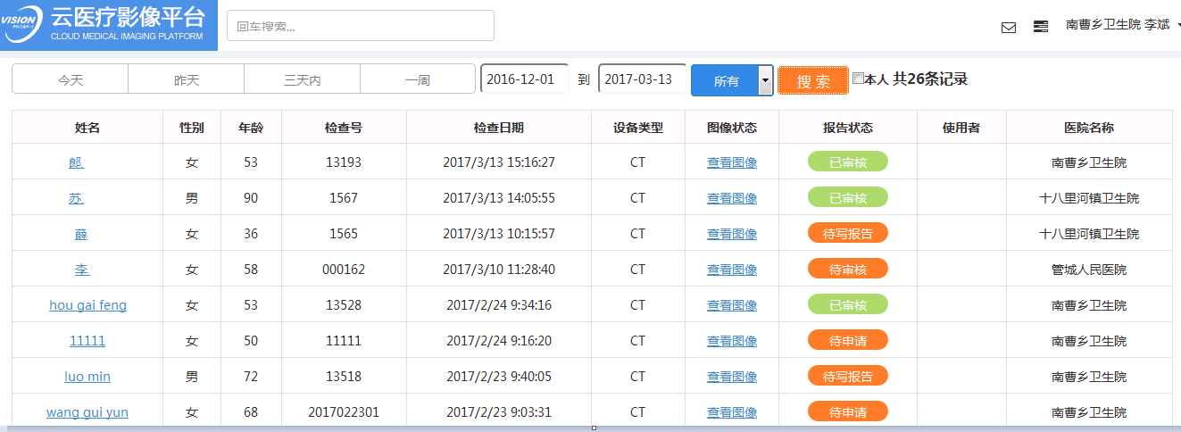 今天、昨天、三天内、一周 和时间段选择区可根据检查时间过滤患者列表;