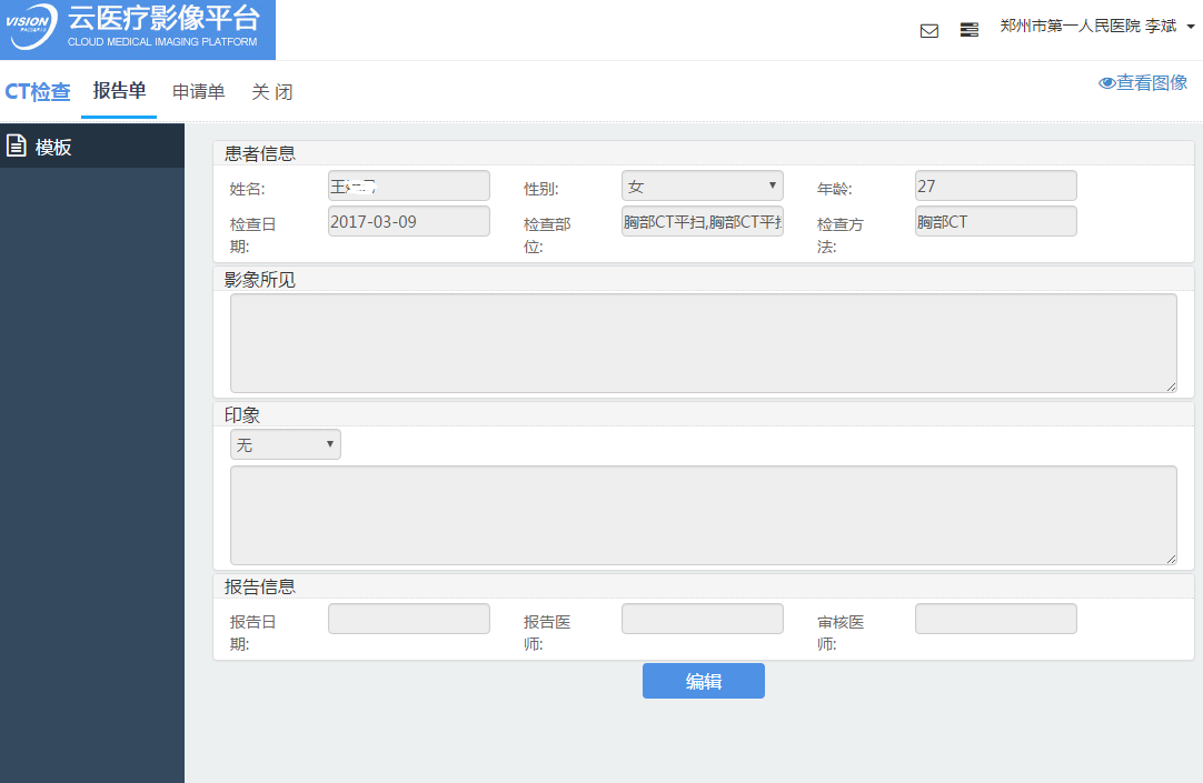 报告医生登录后,列表页面状态显示待写报告的病例,点击病例姓名进入报告书写界面: