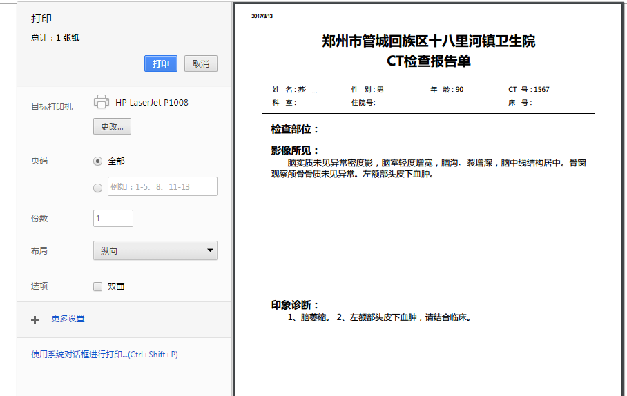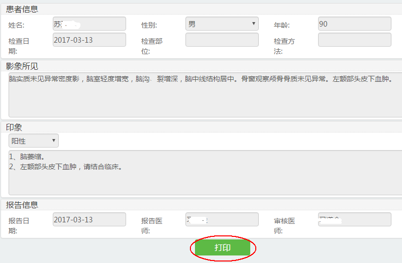 列表界面状态为“已审核”的病例可通过点击姓名进入报告查看界面,点“打印”可进入打印预览界面: