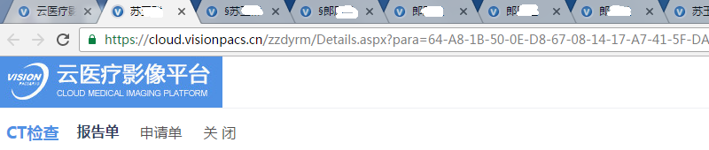 在打开多个页面时,可通过页标题切换不同的窗口,标题会显示病例姓名,图像查看的窗口显示姓名前会加上“§”符号以方便区分。